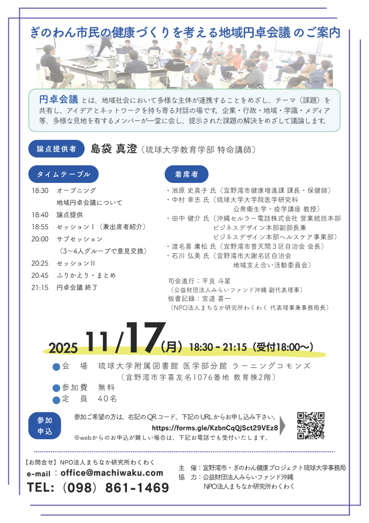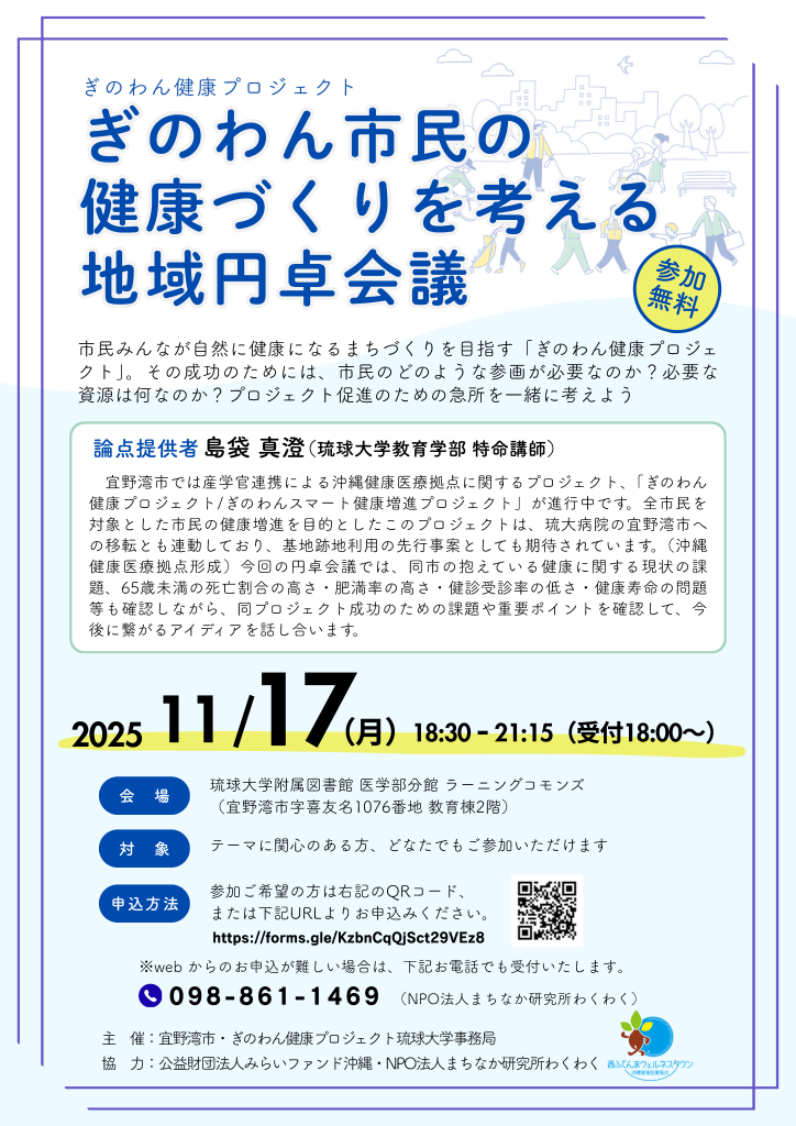 宜野湾市と琉球大学が連携して進めている「ぎのわん健康プロジェクト」の一環として、地域の健康づくりをテーマにした「ぎのわん市民の健康づくりを考える地域円卓会議」を開催します。