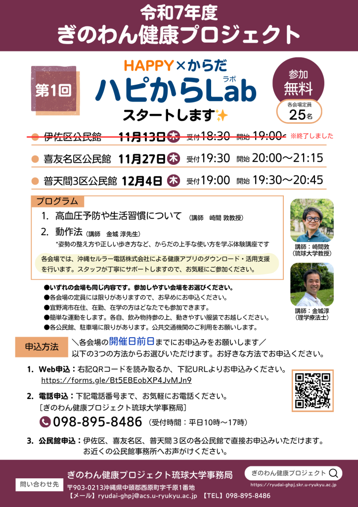 11月20日(木)に予定しておりました「第1回 ハピからLab」の喜友名区公民館での開催は、11月27日(木)20:00~に変更させていただくこととなりました。