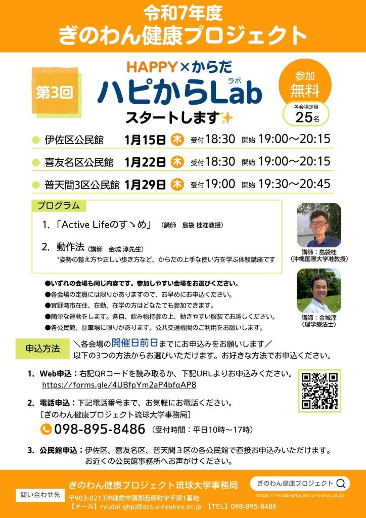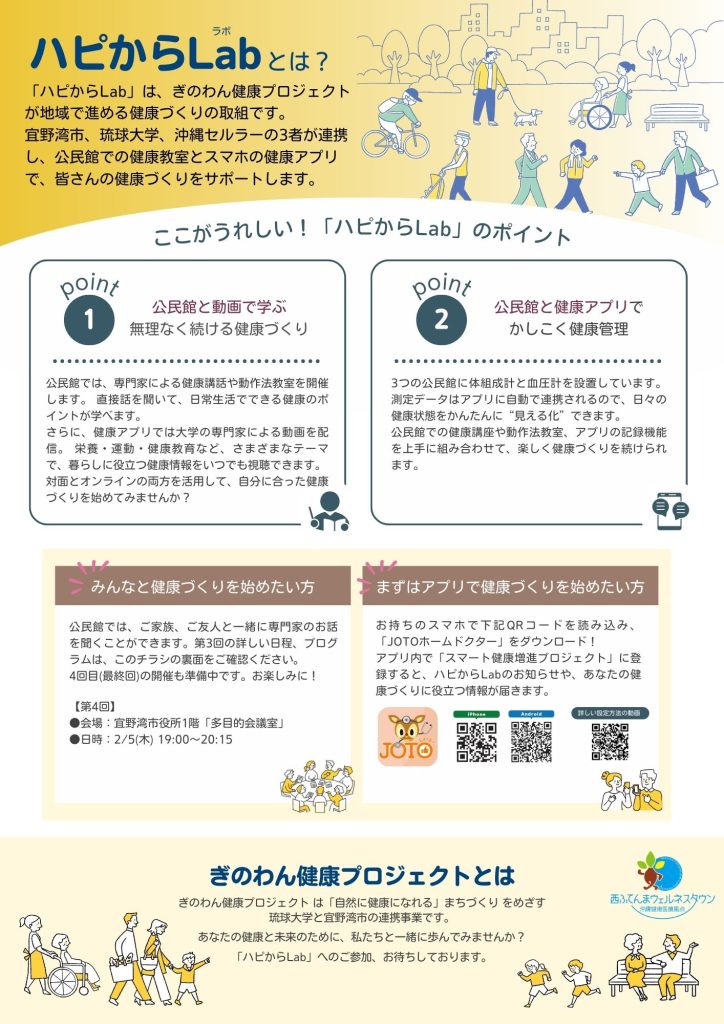 ぎのわん健康プロジェクトでは、公民館を拠点に、地域のみなさんが楽しく参加できる健康教室「ハピからLab」を開催してます。