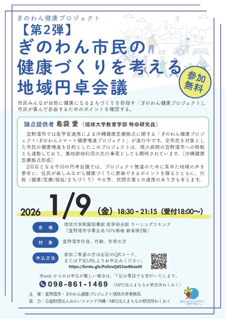 宜野湾市と琉球大学が連携して進めている「ぎのわん健康プロジェクト」の一環として、地域の健康づくりをテーマにした「第2弾 ぎのわん市民の健康づくりを考える地域円卓会議」を開催します。